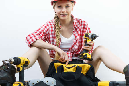 Woman holding yellow driller about to drill something. Hardware construction site objects concept.