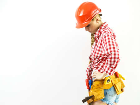 Sad construction worker woman wearing toolbelt and red helmet standing against white isolated background.