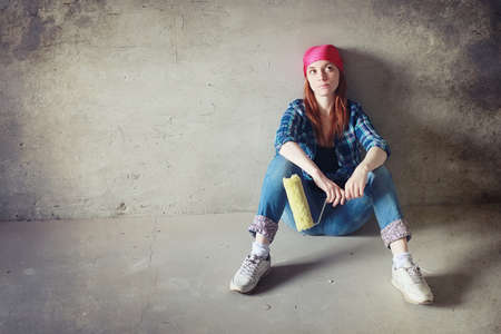 Young funny girl with curly hair posing with the painting roller - creative diy house decoration. High quality photo