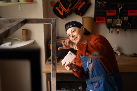 Young professional mechanic or craftsman woman in blue overalls take photo on mobile phone fix restoring problems in repair renovation workshop.