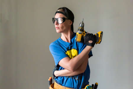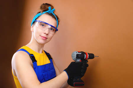 Woman builder with a drill in her hands For any purpose.