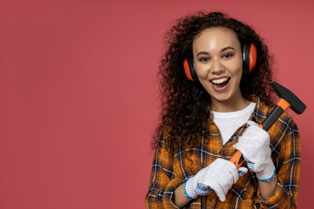 A girl in construction headphones and with a hammer in her hands