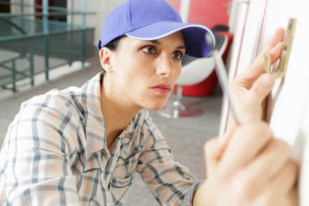 beautiful woman putting a nail into the wall