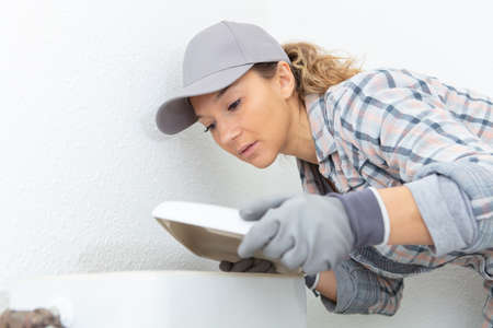 female plumber fitting lid back on to toilet cistern