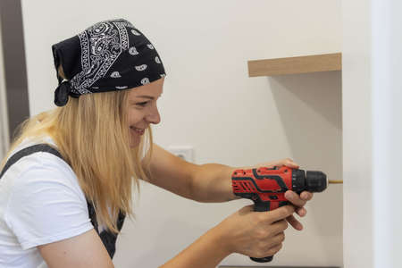 a beautiful girl of European appearance with blond hair in a black bandana, white t-shirt and in a special suit drills a hole in a white wall with a drill. The concept of equality and work
