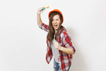 Young irritated dissatisfied woman in protective construction helmet swinging toy hammer and screaming isolated on white background. Instruments for renovation apartment room. Repair home concept