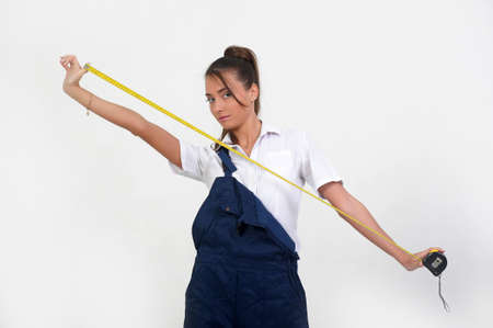 Young woman in overalls with a measuring tape