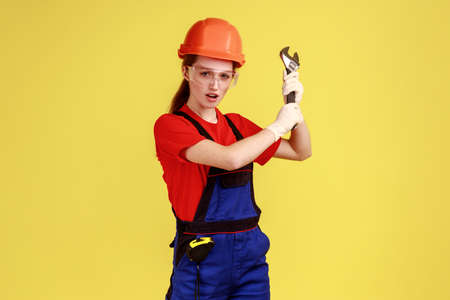 Portrait of crazy builder woman holding adjustable wrench, looking at camera with excited facial expression, wearing overalls and helmet. Indoor studio shot isolated on yellow background.