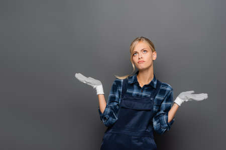 Workwoman in gloves and overalls looking at camera isolated on grey