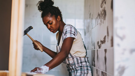 Confident Woman Renovating Bathroom with Hammer and Determination.