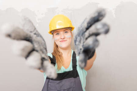 Attractive young woman doing repairs at home. Portrait of a female construction worker. Building, repair concept.