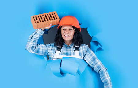 builder assistant wear protective helmet. girl in workshop uniform. repairing tools used in engineering. architect working with brick. female foreman on construction site