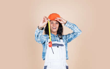 woman architect in helmet. girl in checkered shirt and protective hard hat. building and construction site. Builder engineer working with measuring tape. Architecture. Building is her life