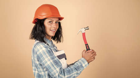 Tools for repair. girl carpenter use hammer. happy beautiful lady engineer. builder assistant repair and fix. female worker in working uniform. cheerful woman wear safety helmet