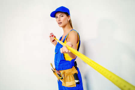 cheerful lady repairman in uniform on blue background, measurement