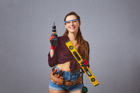 Woman worker in coverall with tool belt posing near grey wall