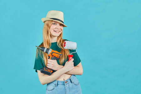 Beautiful girl wearing a straw hat with an electric screwdriver and an paint roller on blue background. Repair home concept.