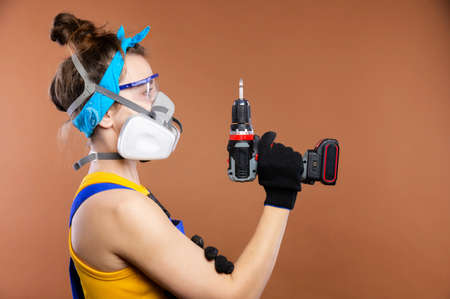 Studio portrait of a female repairman in goggles and a respirator with a battery-powered electric screwdriver. Caucasian woman carpenter in work overalls