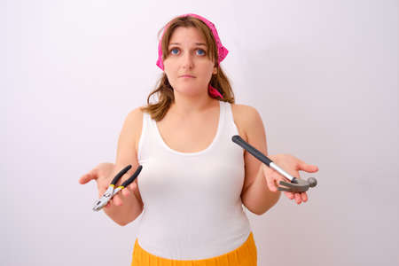 Woman holds tools in her hands - problems with repairs on her own
