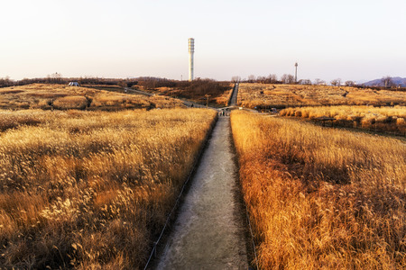 wild reeds on top of haneul park in seoul, south korea taken during winter sunset hours. Haneul park is located in mapo district near the stadium.