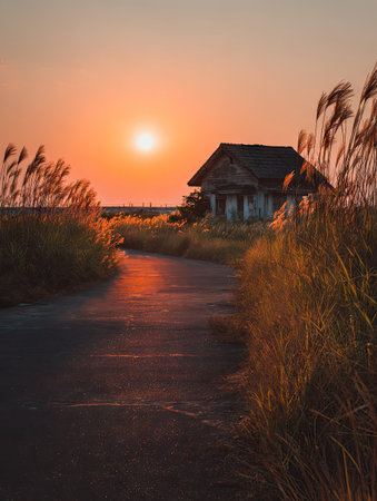 An inviting scene features a road winding towards a modest house bathed in the warm light of sunset. The composition highlights the sun's glow and the textures of tall grass. This serene image suggests a quiet, natural environment and could be used for various projects.