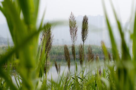 Reed grass and Chinese pavilion in winter, closeup of photo