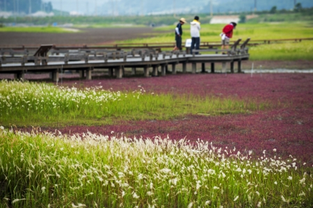 Dakmeor reed field wooden deck road, olle trail in Jeju island, Korea