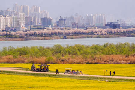 Busan, South Korea .April 3,2019: Tourist walking at Yuchae Canola Flower Festival in Daejeo Ecological Park, Busan, South Korea.