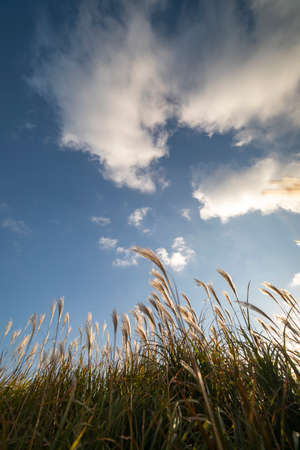 Beautiful dry grass with blue sky in the meadow, Thailand.