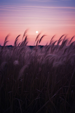 Sunset in a field of tall grass, soft focus and small depth of field