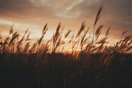 Golden Hour Serenity: Capturing the Graceful Silhouette of Grass under Grey Clouds