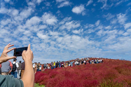 Tourists taking pictures on the Miharashi Hill in the Hitachi Seaside Park during the Red Kochia Carnival. Ibaraki Prefecture, Japan.