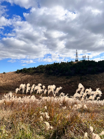 View of Heyyo Farm in Saebyeol Oreum taken during autum season with tall silver grass. Taken in Jeju, South Korea