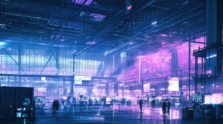 A captivating futuristic urban scene featuring neon lights and advanced technology displays within an industrial space. The vibrant ambiance creates an innovative atmosphere filled with silhouettes moving through the luminous environment.