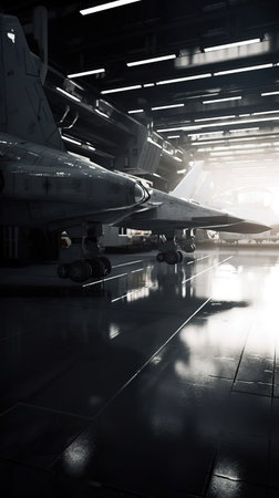 A sleek fighter jet is front and center in a spacious, well-lit hangar. Engineers are visible in the background, ensuring the aircraft is ready for flight.