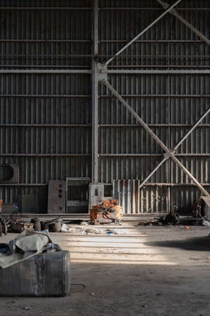 Abandoned industrial interior of a building with sunlight rays passing through