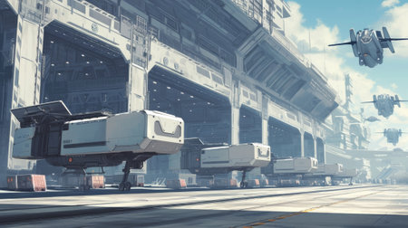 A line of eVTOLs waits patiently in front of a large logistics hub ready to assist in the seamless movement of goods and materials across the highly advanced industrial complex