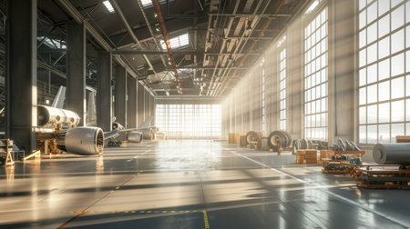 A bright and airy photograph of a spacious warehouse filled with aircraft engines, with large windows letting in natural light, creating a welcoming and productive atmosphere. --ar 16:9 --v 6 Job ID: 68342a34-beea-4690-bccc-e153cd38cca2