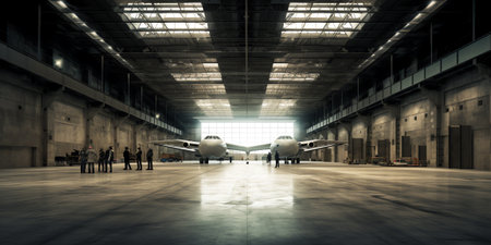 modern aviation hangar with sleek aircraft and technicians working on them, created with generative ai