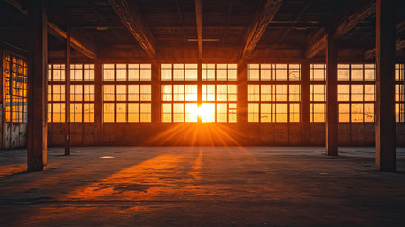 A breathtaking sunset filters through large windows of an abandoned industrial warehouse, casting long shadows and creating a serene yet dramatic atmosphere within the space.