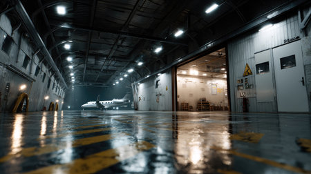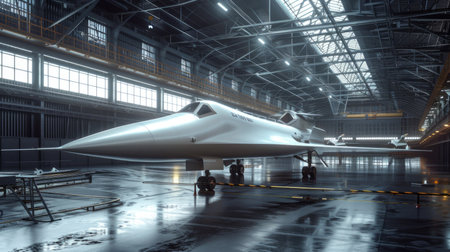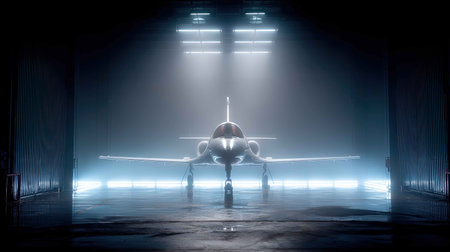 This captivating image depicts an airplane situated in a spacious industrial hangar, illuminated by dramatic lighting. The scene highlights the aircraft's sleek design and operational scale, providing insights into the aviation industry.
