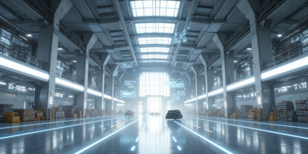 Warehouse Futuristic Interior Autonomous Vehicle moves through illuminated aisle