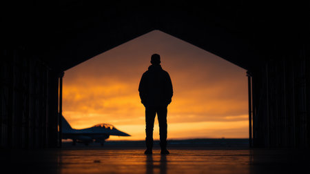 A man stands in a hangar with a plane in the background. The sky is orange and the man is silhouetted against the background