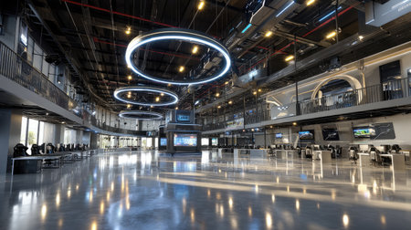 A modern music studio showcasing a sleek interior with advanced lighting and ample workstations for creative collaboration. The spacious layout invites professionals to thrive.