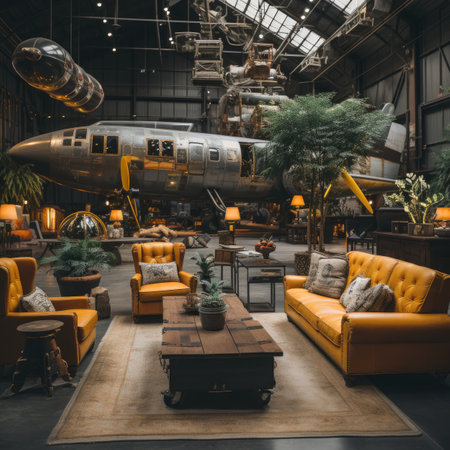 This vibrant aviation hangar showcases vintage airplanes under a bright, spacious interior. The industrial design and colorful accents create an inviting atmosphere for aviation enthusiasts and photographers alike.