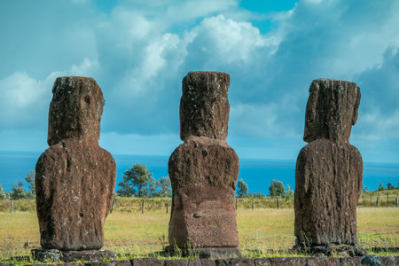 Back view of moai statues against a cloudy sky, Chile, Easter Island (Rapa Nui). One of the most mystical tourist attractions in the world.