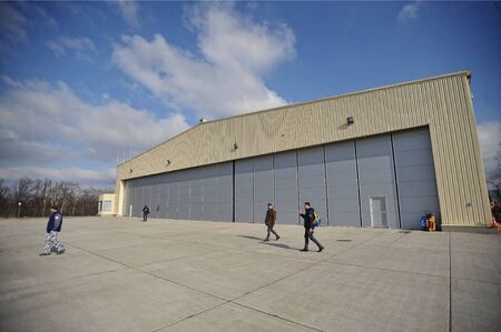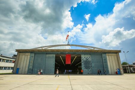 VELIKA GORICA, CROATIA - MAY 13, 2017 : The Aeronautical Tehnical Center hangar where the aircrafts are exhibited with people sightseeing at the AIRVG2017 the aviation day in Velika Gorica.