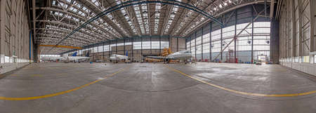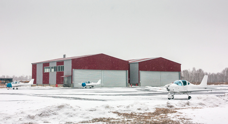 Maintenance aerodrome with planes and hangars. Airplane parking area. Industry