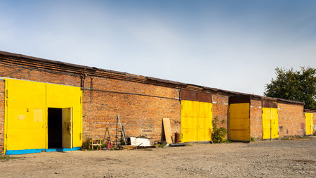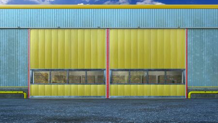 Facade of a yellow metal warehouse, a commercial building with entrances for cars for storing goods. The concept of storage of goods by importers, exporters, wholesalers, transport enterprises, customs
