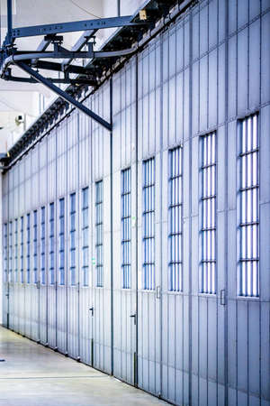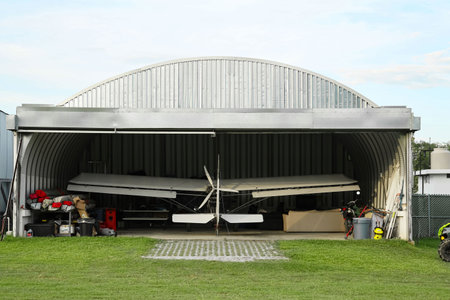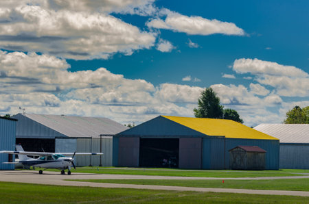 Metal structure hangar from a private airport in Germany. Hangar exterior view on a beautiful summer day. Private airport hangar.